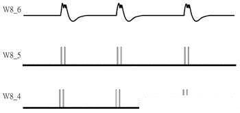 参照图3错动式讯号图,W7_3为受电线圈讯号、W7_1与W7_2分别为P04与P11讯号、W7_4为S1讯号,其与W7_3不同在于通过一个C1电容之谐振效果后取得较强电流推力,其波形也会接近方波讯号;W7_5与W7_6分别为S12与S22讯号,从图3中可看到设计中的调制讯号从线圈两端分别进行调制,并分成调制单端、解除调制、调制另一单端后再解除调制完成,此设计的用意在于对受电线圈接收电力影响最小的情况下,产生最大调制讯号。