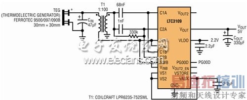 需要注意:在单极性配置中,LTC3109对TEG呈现出约1Ω的负载电阻,因此应选择一个具有非常低源电阻的TEG以实现优良的负载匹配,否则在单极性配置中使用LTC3109将毫无优势可言,这一点很重要。本例中所采用的TEG具有1.0Ω的标称源电阻,旨在实现最佳的功率传输。