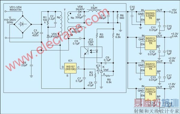 开关电源多路输出一般通过增加高频变压器反馈端来实现,这使得开关电源在设计过程中增加了设计者的工作量。应用LDO作为开关电源的输出终端,可以极大地简化开关电源的设计,缩短开发周期。