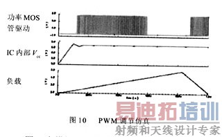 仿真过程中,着重对正常运行、过压、欠压、过流、过载等情况做了分析。图10中模拟了负载变化时功率MOSFET输出的变化情况。最下面一条波形为负载情况经过光耦合和低通滤波器后的电压,中间一条波形为IC内部电压 Vcc信号,最上面一条波形为功率MOSFET栅极上的驱动电压信号。可以看出,由于充电,Vcc不断增加达到8.6V时便不再增加(过压保护电路起作用),IC开始工作。当负载逐渐变小时,引起反馈电压升高,使得反馈到IC的信号增大,其功率MOSFET栅极的驱动电压的占空比减少,最终为0。