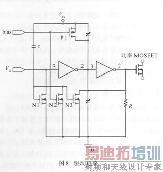设计驱动电路的目的是为了去除驱动信号的毛刺和对功率MOSFET的栅极起保护作用(图8)。正常时,N1、N2、N3都处于截止状态。当电路内部电源电压Vcc由低电平突然变为高电平时,电容C两端电压不能突变,这样N1导通,使输出为0。另外当IC突然上电时,由于功率MOSFET的栅漏电容的存在,使栅极的电压为高电平,但是由于设计中加了电阻 R和N3的存在,对栅极构成旁路,起到保护作用。最后就是如果IC突然断电时,则功率管漏极没有大电流供给。如果此时驱动为高电平,则可以从 R上卸流,最终使低电平变低。总之,N1、N2、N3对功率MOSFET 的栅极起保护作用。