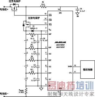 这里以MAX1894/MAX1924为例说明其功能及特点。MAX1894设计用于4节锂离子电池组,而MAX1924适用于3节或4节的电池组。两个保护器可监控串联电池中每一个电池的电压,避免过充电及过放电,从而有效地延长电池的寿命。另外,它也能防止充、放电时电流过大或短路。