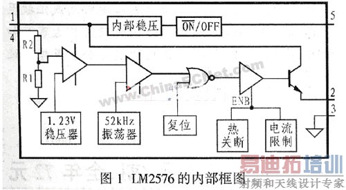 LM2576的内部框图如图1所示,该框图的引脚定义对应于五脚TO-220封装形式。