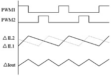 (2) 由于各个变换通道交叉开闭,电流相互叠加,大大减少了输入、输出电流纹波,减小了电磁干扰EMI。电流纹波的减少,使传统的昂贵的、不易安装的电解电容器可以采用小型的贴片陶瓷电容来代替。参看图2中输出电流纹波的示意图,2个通道的IL纹波电流相互叠加,结果使输出电容上承受的纹波电流减小。