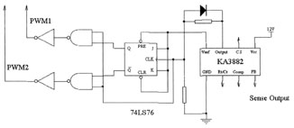 下面再来研究一下如何利用一个普通的PWM控制IC, 产生交叉ON/OFF的2相PWM控制脉冲。所需器件有一个JK触发器, 2个与非门,2个反向驱动器。接线图见图6。设控制IC的输出脉冲频率为fsw,将可以产生2个频率为fsw/2, 相位相对间隔180°的2相PWM驱动信号。各处的脉冲波形见图5。这是产生2相PWM控制信号的基本方法之一。