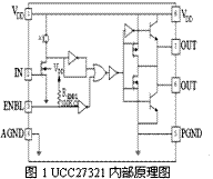 UCC27321的ENBL是给设计者预留的引脚端,为高电平有效(见表1)。在标准工业应用中,ENBL端经100K的上拉电阻接至高电平。一般正常工作时可以悬空。为求可靠,也可将其接至输入电源高电平,低电平时芯片不工作。通过对ENBL的精心设置可以设计出可靠的保护电路。