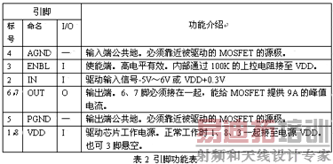 TI公司推出的新的MOSFET驱动芯片能输出9A的峰值电流,能够快速地驱动MOSFET开关管,在10nF的负载下,其上升时间和下降时间的典型值仅为20ns。工作电源为4—15V。工作温度范围为-40℃—105℃。图1给出了芯片的内部原理图,表1为输入、输出逻辑表。表2为各个引脚的功能介绍。