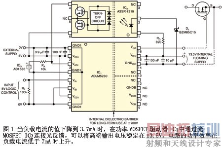 IC1是美国模拟器件公司(Analog Devices)推出的一款ADuM5230集成电路隔离式驱动器。它可以将5V的输入电压提高到足以驱动MOSFET导通电阻到一个低值的水平,最大限度地减少功耗(图1)。 但是,在低开关频率的情况下,IC的高端内部18V箝位消耗该集成电路从低端5V电源获得的能量(参考文献2)。