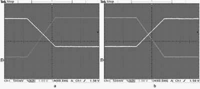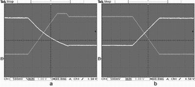 即便是满负载,该系统也可以正确地将转换器的输出电压控制在设定电压的1% 误差内。由ADC得到的反馈可以补偿负载变化、失调和输出电压漂移,以准确控制输出电压。图4a和图4b是电源电压在1mA负载时的性能,图5a表示VOUT和VDAC在VOUT 由4.5V转变到1.5V时的变化,图5b为VOUT和VDAC在VOUT 由1.5V转变到4.5V时的变化。从中可以看出VOUT的下降速率比上升速率慢很多。这是由于输出大电容放电所致(见图2的C16)。转换器可以非常快地对电容充电,但负载没有办法使电容快速放电。注意电压的变化速率非常接近,因为350mA负载可以使电容足够快地放电。这样,一个足够大的负载可以使VOUT以同样速率增加或减小。