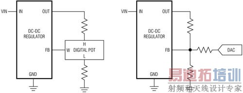 很多电信、网络、存储和服务器设备在制造期间,往往采用容限工艺规程,使系统维持坚固的可靠性能。此工艺涉及系统(或处理器)的评价,使系统电源偏离额定电平进行评价。为了改变电源电平,通常用数字电位器或电流DAC改变DC-DC变换器电源的反馈回路来调节。图6示出加容限到电源的很多方法中的两种。其他通用方法包括通过一个数字接口编程电源输出或调节电源。不同程序的容限控制包括“合格/失效”方法(对所有电源增加或减少±5%或±10%电平)和精细的调节方法(电源以10mV或100mV较小的步长增加或减少电源电平);后一种方法允许更详细地评价系统性能。