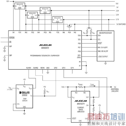 图7示出MAX6870系统管理器件监控和定序几个系统的电源框图。当+12V总线电压增加并超过其阈值(存储在MAX6870中)时,MAX6870一个输出立即或一个延迟周期(也存储在MAX6870存储器中)之后,使能+5V稳压器。在+5V稳压器上升,而且输出超过它所对应的阈值时,+3.3V电源除去停机。然后,剩余的电源依次以相同的方法增加(除非在MAX6870增强N沟道通路器件时,+5V开关电源变为有效)。