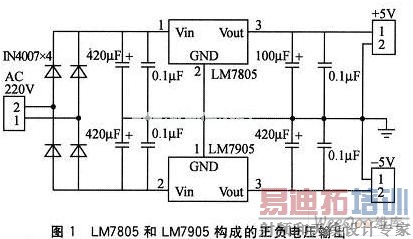 78和79系列分别是正电压和负电压串联稳压集成电路,体积小、集成度高、线性调整率和负载调整率高,在线性电源时代占领了很大市场。LM7805为固定 +5 V输出稳压集成电路(采取特殊方法也可使输出高于5 V),最大输出电流为1 A,标准封装形式有TO-220、TO-263。78和79系列集成电路应用相对固定,电路形式简单,只是正负直流电压输出时应注意变压器最小输出功率和最小输出电压,如图1所示。