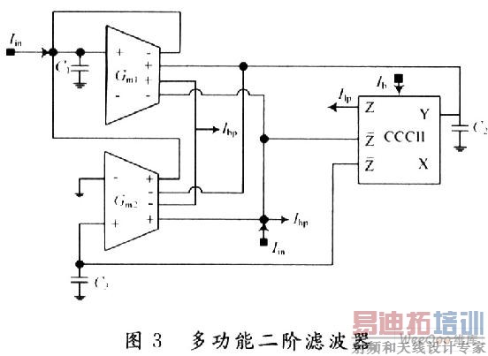 一种将MO-OTAS和CCCII±相结合所得到的双二阶滤波器如图3所示。其中,Iin为输入电流;Ilp,Ihp,Ibp分别为低通、高通、带通输出函数。该电路的有源器件在输入端输入信号时,在输出端通过电流镜技术可以获得多个输出,而且由于输出端的高阻抗,可以将各个输出端任意组合而得到二阶陷波和全通函数。