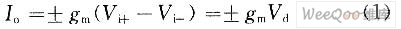 式中:Io是输出电流;Vd是差模输入电压;gm是开环增益,称为跨导增益,它是外部控制电流Ib的函数。CCCII±的端口特性由下列混合矩阵方程给出: