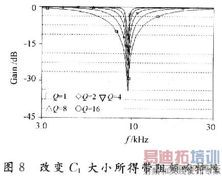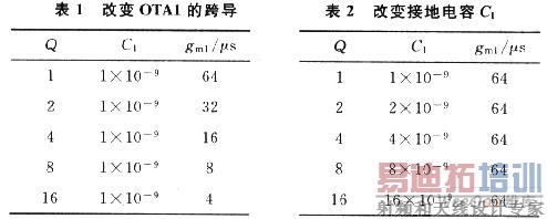 为了简化分析式(8),式(9),这里假设gm1=gm2=gm,而且C2=C3=C,当调节C1或gm1的数值时,可以看见Q在随其变化,而ω0仍然保持不变。可见,滤波器的特征频率和品质因数可以独立进行调节。