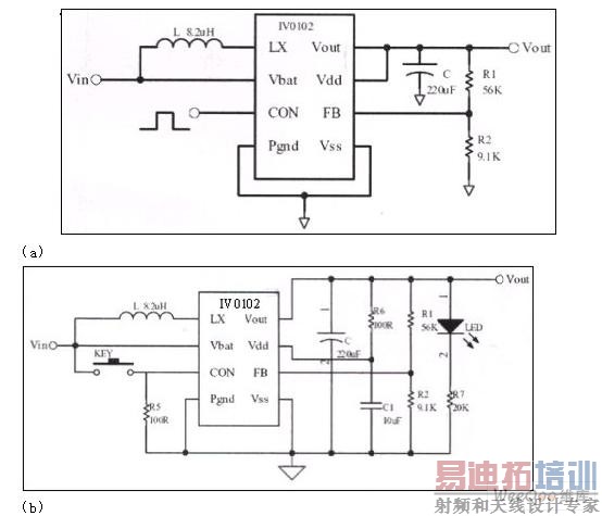 IV0102作为升压电源,最普遍的应用如图8(a)所示。如要将此路的输出电压设置为5.72V,分压电阻R1,R2由下面公式决定。
