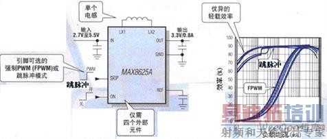 MAX8625A PWM升/降压调节器是针对便携式电池供电设备中的数字逻辑电路、硬盘驱动、电机及其它负载供电而设计,适用于PDA、蜂窝电话、数码相机(DSC)、MP3播放器等产品。MAX8625A在2.5V~5.5V输入范围内可提供固定3.3V或可调(1.25V~4V)输出,电流高达0.8A。MAX8625A采用2A峰值限流。专有的H桥技术在所有工作模式下可提供无缝切换,消除了其它器件中存在的尖峰干扰。4个内部MOSFET(2个开关和2个同步整流器)提供内部补偿,大大减少了外部元件数。SKIP输入用于选择低噪声、固定频率PWM模式或高效跳脉冲模式。如果选择跳脉冲模式,轻载时转换器将自动切换至PFM模式,进一步提高轻载效率。内部振荡器工作在1MHz,允许使用小尺寸外部电感和电容。MAX8625A的限流电路在输出过载时关断器件。此外,软启动功能有助于抑制启动过程的浪涌电流。该器件还具有真正的关断(True Shutdown )功能,器件禁用时,断开输入端与输出端的连接。MAX8625A采用3mm×3mm、14引脚TDFN封装。图2左为MAX8625A引脚功能与应用示意图,图2右为跳脉冲、FPWM模式下效率与负载电流的关系。其优点是单个电感、引脚可选的强制PWM(FPWM)或跳脉冲模式,仅需四个外部元件。