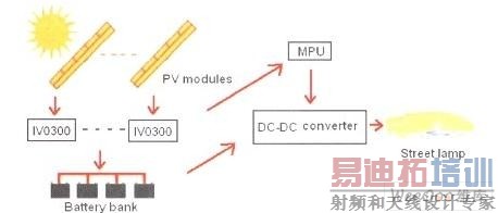此系统包括6大部分:光伏组件(太阳能电池板),分布式太阳能最大功率跟踪系统(DMPPT),蓄电池(1000AH),微处理器(MPU),直流电源转换,LED路灯(30W-50W)。在此系统中太阳能给蓄电池充电通过分布式最大功率跟踪(DMPPT)进行控制,采用并联方式,每组太阳能电池板独立工作,分别对蓄电池充电。蓄电池通过直流电压转换芯片,得到满足路灯工作所需电压和微处理器(NPL)工作电压。微处理器(MPU)控制路灯的开启关闭和电池的选择,采用光控开,定时关。当夜幕降临时,微处理器(MPU)通过检测光强启动LED自动点亮,点亮—定时间后,其内部定时器控制LED自动关闭,有效做到节能降耗。点亮时间一般设定为(6-10)h,该时间受区域限制,一般南方地区设定为(6-8)h,北方地区设定为(8-10)h。本系统设定的为10h。该系统采用的是大容量蓄电池小功耗照明,一次充足电后,可以连续工作7天,且避免了在使用过程中造成蓄电池过放电而损坏其使用寿命。另外,由于使用了IV0300,整个系统在晚上关闭前(即光强较弱时)还能工作,继续充电。