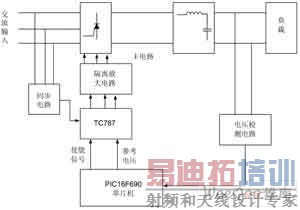 系统主要电路包括:三相桥式半控整流电路、同步信号取样电路、单片机控制电路、晶闸管触发电路。首先,由同步信号取样电路得到同步信号并送集成触发芯片TC787,经过零检测,再进行相应的延时以实现移相。单片机中的ADC负责采集直流母线电压,根据电压的设定值与实际值的偏差经过PI运算来调节给定输出。PIC单片机将电压的参考值输出到TC787,由TC787实现对晶闸管的移相触发,以实现整流调压。硬件电路的整体框图如图1所示。