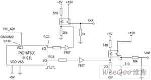 采用PIC16F690作为控制芯片。PIC16F690单片机内部自带10位AD;宽工作电压(2.0~5.5V);低功耗;带有PWM输出功能;内部自带晶振。用芯片内部自带10位AD,对采集到的直流侧电压进行AD转换。为了降低硬件成本,直接采分压电阻代替电压传感器来采集直流侧电压,分压电阻上的电压经过两个反向比例电路到单片机。单片机的模拟地和信号地直接相连(也可以通过磁珠相连,以减小干扰)。PIC16F690单片机通过一个IO口使能或禁止芯片TC787的输出,如图3所示。当PIC单片机的I/O口RC3输出高电平(+5V)时,Lock口为低电平;当单片机I/O口RC3输出低电平时,Lock为高电平(+15V)。选用一个IO口作为TC787参考电压的给定信号,采用PWM脉冲方式,调节占空比来调节输出电压, PWM波经过一个RC低通滤波器后为一个近似直流信号,用这个信号作为参考电压给定Uref,其范围为0~5V。由于芯片TC787所需的给定输入范围为0-15V,所以PWM波要经过一个光耦进行电平转换,如图3所示。