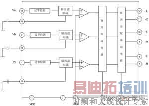 触发芯片选择高性能晶闸管三相移相触发集成电路TC787。TC787可单电源工作,亦可双电源工作,主要适用于三相晶闸管移相触发和三相功率晶体管脉宽调制电路,以构成多种交流调速和变流装置。TC787的内部结构如图4所示。