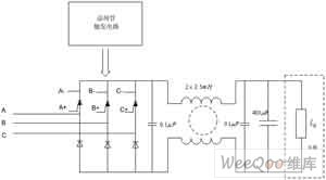 主电路采用三相桥式半控整流电路,直流测采用LC滤波电流结构,主电流原理图如图2所示。半控桥选择SEMIKRON公司的SKDH146/120-L100模块,该模块额定电流140A,额定电压1200V。直流侧采用LC滤波电路结构,比单独电容滤波效果好。此外,还可以提高交流输入侧的电流THD。直流侧主要的谐波含量为工频的6倍及6的整数倍,设计LC低通滤波时要避免含量较高的谐波引起的谐振。在本设计中选取电感5mH,滤波电容480μF。