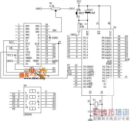 利用单片机AT89S51与ADC0809设计一个数字电压表,能够测量0-5V之间的直流电压值,四位数码显示,但要求使用的元器件数目最少。