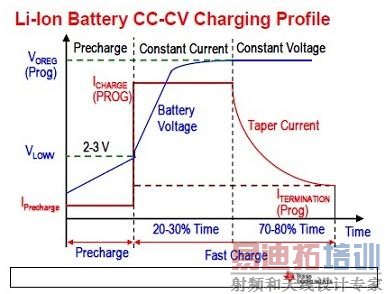 关于锂电池的电池管理,王轶则表示,锂电池很好用,但是也会有危险,会产生各种各样的爆炸。对与锂电池的电池管理来说有几个基于安全的考虑。第一,充电最佳温度是 0~45℃,必须把温度考虑到充电管理里面去。第二,充电时间,充电截止不可能说一点电都充不进去,所以需要注意什么时候要待机,一般充电是在二分之一的时候就把它关掉。就充电过程来说,首先是电池电压,如下图所示,蓝色的是电压,红色的是电流,如果电池介于2和3之间,这个时候需要注意。这叫充电交流,慢慢给它充电,之后电压会不断地提高,等降到一定程度的时候,说明充电可以截止了。还有就是28定律,在充电的时候,只用20%~30%的时间就能把电池 80%的充满。