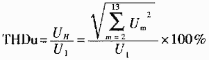 利用基-2的FFT算法,可通过实际的32个采样点求得基波和各次谐波电压分量的均方根值Um,然后将其结果每5次取一次算术平均值作为测量的结果,进而可以算出总的(2~13次)谐波含量UH和电压总谐波畸变率THDU。THDU为: