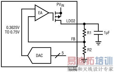 R1 和 R2 形成了用于设定稳压器输出电压的反馈电阻分压器,详见图 2 和图 3。0.3625 是 5 位 DAC 基准输入至误差放大器的最小电压值。0.0125V 是 DAC LSB 步长。BxDTVx 是存储于 I2C 寄存器中的二进制代码 (十进制数值为 0 至 31)。