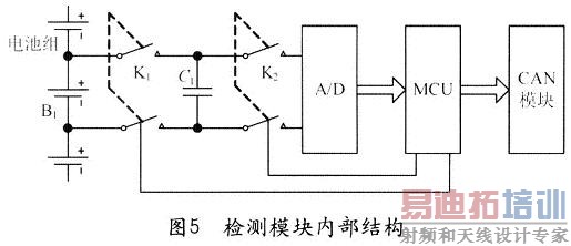 为了克服模块从电池上持续取电的问题,我们将所有模块统一供电,由一个总开关控制。这就牵涉到供电回路与电池的隔离问题。为解决该问题,我们采用“桥电容”技术。图5是模块内部框图。“桥电容”的工作原理是这样的:MCU首先将双刀单掷开关K1合上,则电池对电容C1充电,由于时间常数很小,电容端电压很快达到电池端电压;然后MCU断开K1合上K2,从A/D上就可采集到C1的端电压,也就是电池的端电压;最后MCU断开K2。从而完成一次采集任务。另外,当模块不加电时,两组开关是断开的,模块不会从电池取电。可见,这种方式不但解决了参考点问题,而且完全隔离了电池与检测电路,其主要缺点是每个模块增加了两组可控开关。可控开关选用光耦继电器AQW212。模块的成本在200元左右,非常适合电动车辆的使用。各检测模块将数据通过CAN总线上传给主控机。由主控机进行处理并显示出来,供驾驶员参考。