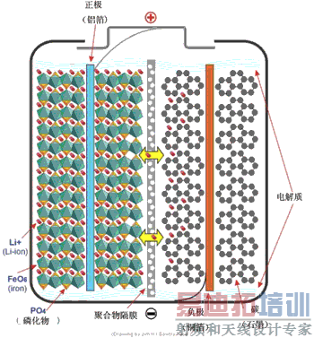 LiFePO4电池的内部结构如图1所示。左边是橄榄石结构的LiFePO4作为电池的正极,由铝箔与电池正极连接,中间是聚合物的隔膜,它把正极与负极隔开,但锂离子Li+可以通过而电子e-不能通过,右边是由碳(石墨)组成的电池负极,由铜箔与电池的负极连接。电池的上下端之间是电池的电解质,电池由金属外壳密闭封装。