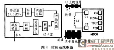 图4给出了H4006的应用系统框图。该系统由卡和读卡器两部分组成。由于H4006是存贮卡,数据传送仅从卡传向读卡器,故读卡器中可无编码和调制电路,仅需解调和解码电路即可。