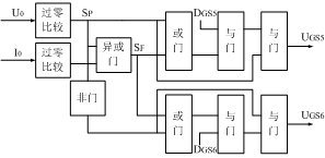 系统控制核心为TMS320F2407型DSP,采用电压瞬时反馈控制,只用一个事件管理器可以实现驱动信号的产生,定时器的工作模式为增减计数,即载波Ut为对称三角波,载波频率和高频链逆变器的开关频率一致,通过正确设置相关寄存器,即可以产生高频SPWM信号来驱动高频变压器前端逆变电路。而周波变换器的驱动信号是由高频SPWM信号和输出电压与电流的过零比较输出信号进行逻辑组合得到。图4为周波变换器驱动信号逻辑组合产生原理。其中输出电压经过过零比较得到SP,与输出电流进行逻辑组合得到SF。再经过一系列逻辑运算得到周波变换器最终的驱动波形。