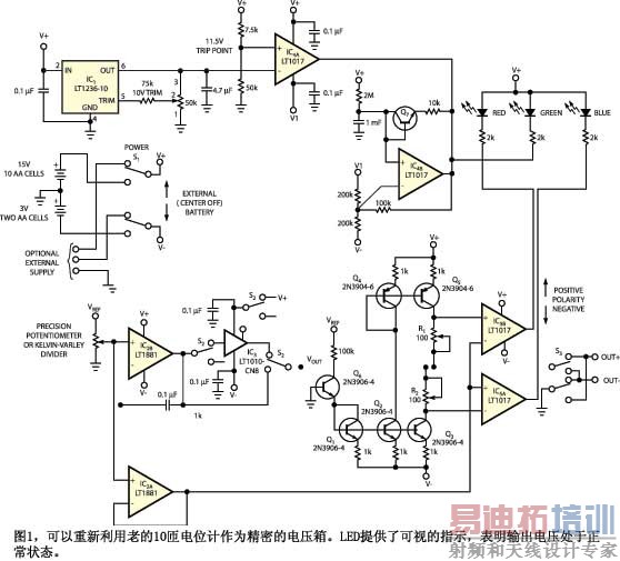 在图1中的电路中有几种类型的电位计,标准10匝电位计通常有0.1%的线性度,对常见的调整效果很好。但有五十年历史的总阻抗为100 kΩ或更低的Kelvin-Varley分压器可达到10ppm的精度。如果电压源有迹象表明其输出是正确的,会很实用。数字式面板仪表是实现此目标的一种方法。然而,即使0.1% 精度的电位计也比这些仪表精度高。所以要表明输出是正确的,只需要知道电源是否接通,电源电压是否够大,输出放大器是否正常工作而并未发出或吸收太多的电流或振荡。