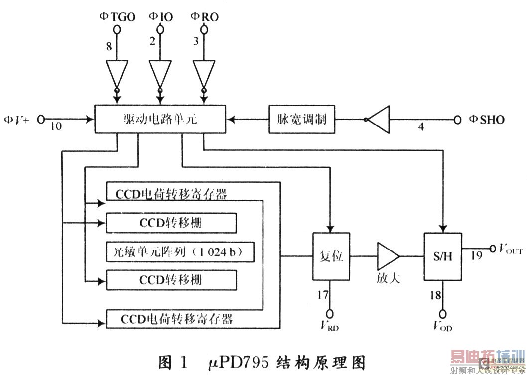 μPD795是NEC公司生产的高灵敏度、低暗电流、具有内置放大电路和采样保持电路的线阵CCD图像传感器。它内部包含一列1 024像元的光敏二极管和两列525位的电荷转移寄存器。可以工作在5 V驱动(脉冲)和12 V电源条件下。同时μPD795具有出色的光电特性,很高的转移效率,达到了99.996%。主要由三个模块组成:表面积分单元,用于产生电荷信号;CCD移位寄存器,用于电荷信号转移;输出放大器,将电荷信号转换成电压信号。