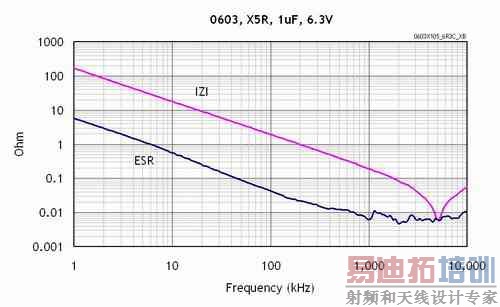 LDO需要增加外部输入和输出电容器。利用较低ESR的大电容器一般可以全面提高电源抑制比(PSRR)、噪声以及瞬态性能。陶瓷电容器通常是首选,因为它们价格低而且故障模式是断路,相比之下钽电容器比较昂贵且其故障模式是短路。输出电容器的等效串联电阻(ESR)会影响其稳定性,陶瓷电容器具有较低的ESR,大概为10 mΩ量级 采用陶瓷电容时,建议使用X5R 和X7R电介质材料,这是因为它们具有较好的温度稳定性。图为X5R的ESR和频率曲线。