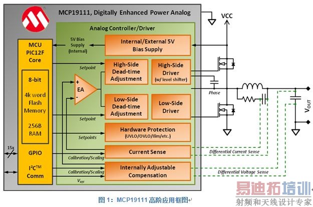 数字控制器和模拟开关稳压器在同一芯片上可以使模拟功能与数字控制紧密融合,从而允许在运行时直接操纵补偿电路、开关频率、死区控制、系统级阈值以及许多其他功能。此外,由于MCU本身采用模拟开关稳压器架构进行封装,因而无需额外的辅助电源或外部MOSFET驱动器。图1给出了MCP19111数字增强型电源模拟控制器的高阶框图以及一个典型应用电路。模拟开关稳压器部分完全涵盖了模拟控制环的所有元件(包括MOSFET驱动器),还包含MCU的辅助电源。数字部分由8位PIC12F中档MCU内核、8 KB的闪存以及256字节的RAM组成。此外,它还提供了多达15个GPIO(其中8个为附加模拟输入)、1个基于I CTM/SMbus的串行通信接口、外部中断以及3个自由定时器。许多内部信号(如输入电压、输出电压或电感电流)可直接在片上进行监视,无需外部传感。数字实现甚至允许读取电流占空比,这在目前还是一项非常有用的功能,但由于许多技术原因,仅供全数字控制器使用。