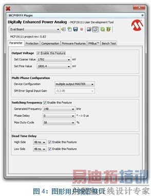 MCP19111的一系列增强功能提供了大量用于配置和优化系统的选项。MCU开放的可编程性增加了更多的自由度。因此,Microchip提供了如图4所示的图形用户界面(GUI),用户无需编写代码即可进行特定调整和配置。此GUI与开源固件配合使用,可以对该固件进行修改并将其用作模板来开发各种更高级的功能。