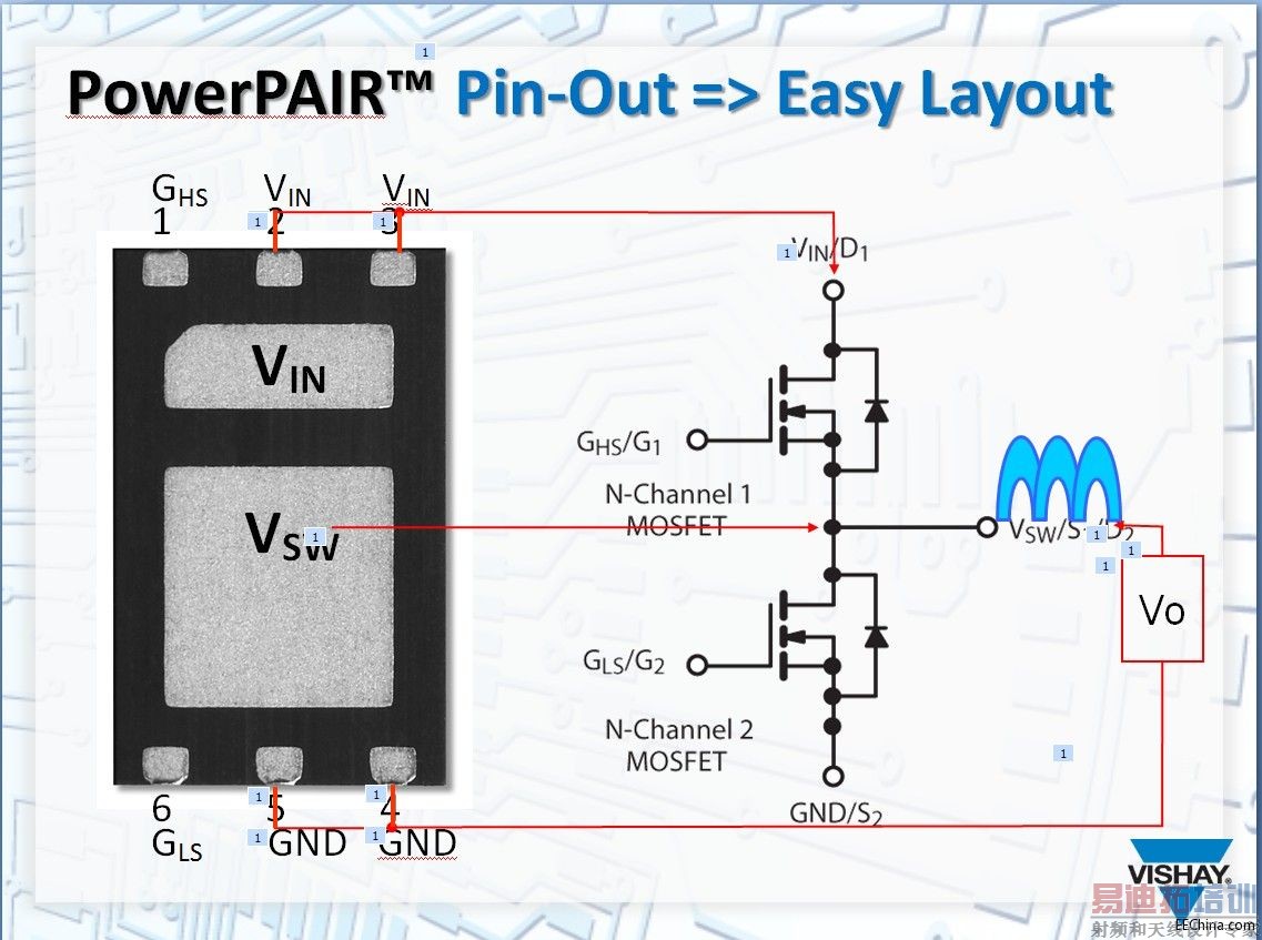 这就是为什么制造商努力设计MOSFET的双芯片功率封装的原因,因为这样就能大大提高可能的最大电流,而且热性能也比传统的表面贴装封装要好。利用这种功率封装的基本原理,把两片分开的芯片装进一个封装,这种器件就能减少电源电路所需的面积。