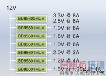 最近的高端FPGA(此次AVNET Internix公司的开发套件为Xilinx Kintex-7用),由于其制程工艺的微细化以及与其相应的低电压化、内核部与接口部的电源分离以及数字电路与模拟电路的混装等多电源化,必然需要先进的电源管理。电压精度当然要求低波纹,而且要求具备投入时序管理和优异的负载瞬态响应性能。图1为ROHM电源模块的输出结构,表示生成上述项目的各开关稳压控制器与电压/电流。