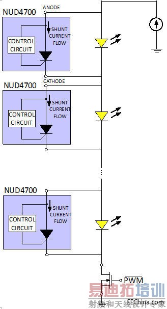 NUD4700兼容脉宽调制(PWM),这是一项关键的调光功能,占空比通常在10%至50%范围。当LED故障开路时,在PWM脉冲的关闭周期,分流保护器处于其低漏电流关断状态。当电流脉冲上升时,分流保护器两端产生电压,因为整个LED串初始为不发光状态。一旦此电压超过击穿电压(VBR),分流保护器就进入低压导电模式。当电流脉冲消失时,分流保护器再次进入不导电状态。NUD4700能够在不到40 ns时间内开关导通及关闭,使其能够轻易地承受200 kHz的PWM频率。