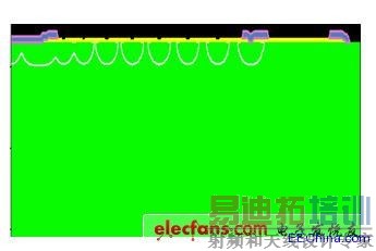 其中距离cell区较近的金属是终端的一个金属场板,在最外围的一个是截止环的金属。从失效现象来看,打火应该是最外围的两个金属之间进行的。工艺上,当初为了节省成本,金属完成后没有加钝化层次,因此两个金属之间是没有氧化等介质的。检查版上数据,金属场板到截止环金属之间距离为72um,怀疑可能此距离太小,又没有介质,因此导致金属之间电场过强,引起打火,为了验证,特对原结构进行了模拟。
