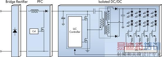 控制回路如图所示采用了微控制器。控制回路通过传感器来测量亮度和颜色,并使用PWM信号来调节LED灯串中的电流。采用PWM输入信号,FAN7346能够控制单个LED串中的电流。电源可以是功率因数校正(power factor correction)前级,后接LLC DC/DC次级,以便为多个LED灯串供电,如图4。电源也可以是一个现有的设计,采用FAN7346来控制对电源的反馈。替代设计可以使用三个功率转换器(30W/10W/10W)组成,各自控制每组LED串,使用白光、绿光和琥珀光生成一个以白光为基础的调谐系统、或使用带有相同电源的三种灯串来“混合”红光、绿光和蓝光三种LED灯串,实现更宽泛的颜色调谐范围。LED颜色无需进行分选;可选择具有照明应用所需性能的低成本LED。