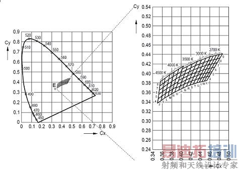 光谱调谐混合数种LED的光谱能量分布,例如适当地混合红光、绿光、和蓝光LED可产生白光。此RGB组合还用于产生几乎所有颜色的光。如果LED驱动器不是设计用于调节一组不同的LED,那么设计人员必须从分选过的LED中选择以便产生特定的颜色。分选是制造商根据发光流明和颜色将LED分类的过程,图1的例子显示了一组行业标准的LED “分类标准”。