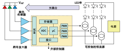 LED驱动器可以采用严格的恒定电流(constant current, CC)输出容差设计,然而,收紧CC容差将增加LED驱动器的成本。由于正向电流经过一组LED,故一个成本较低的解决方案是设计人员使用反馈系统来调节LED色偏,通过反馈来补偿颜色变化。