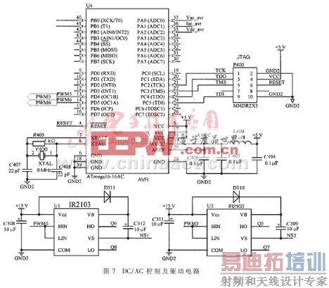 逆变电路采用ATMEL公司8位AVRmega16单片机控制。该单片机具有2个分别独立可预分频的8位定时/计数器;1个具有比较、捕获的16位定时/计数器;4路PWM通道;8路10位ADC等功能。