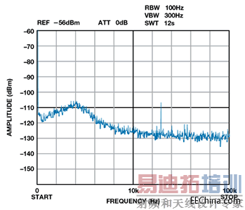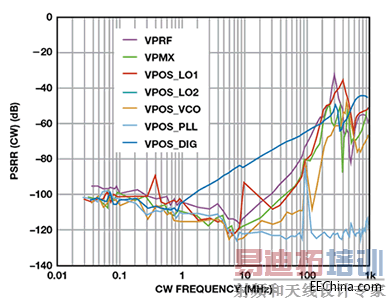图中提供了各电源引脚处的电源灵敏度数据,这些数据非常有用。VPOS_PLL 具有最差电源抑制性能,因此,是最灵敏的电源节点。该电源引脚驱动PLL 电路,包括参考输入频率、相位频率检测器和电荷泵。这些灵敏的功能模块决定着LO 信号的精度和相位性能,因此,其上耦合的任何噪声都会直接传播到输出端。