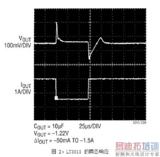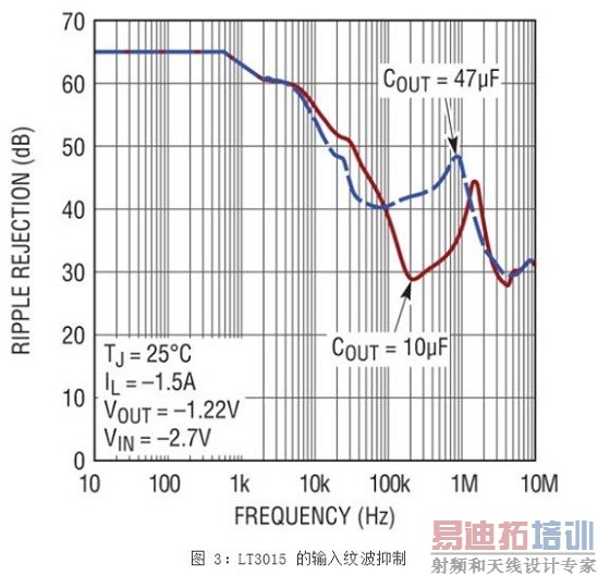 LT3015 的创新设计提供了多项可在任何设计中实现简单和高性能的特性。高增益带宽误差放大器可提供快速瞬态响应和高电源抑制比 (PSRR)。此外,该器件的 PSRR 性能指标相比于领先的正 PNP LDO 稳压器改善了 4倍,并且甚至到 10MHz 频率下都保持了很高的抑制水平 (>25dB),见图 2 和图 3。