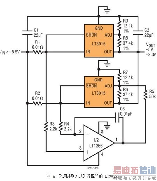 应选择合适的电阻器 R5,以使其不要在运放的输出端上产生过大的电流摆幅,从而让从属器件的 ADJ 引脚达到平衡状态。此外,R5 还通过解除补偿电容器 C3 与从属稳压器之 ADJ 引脚之间的耦合而对环路稳定性有所帮助。另外,并联多个稳压器也是件相当容易的事情。需要做的只不过是为每个附加的稳压器增设一个运放和一个检测电阻器,这基本上就是图 4 中之从属稳压器的一个“复制品”。